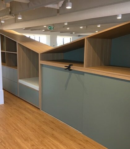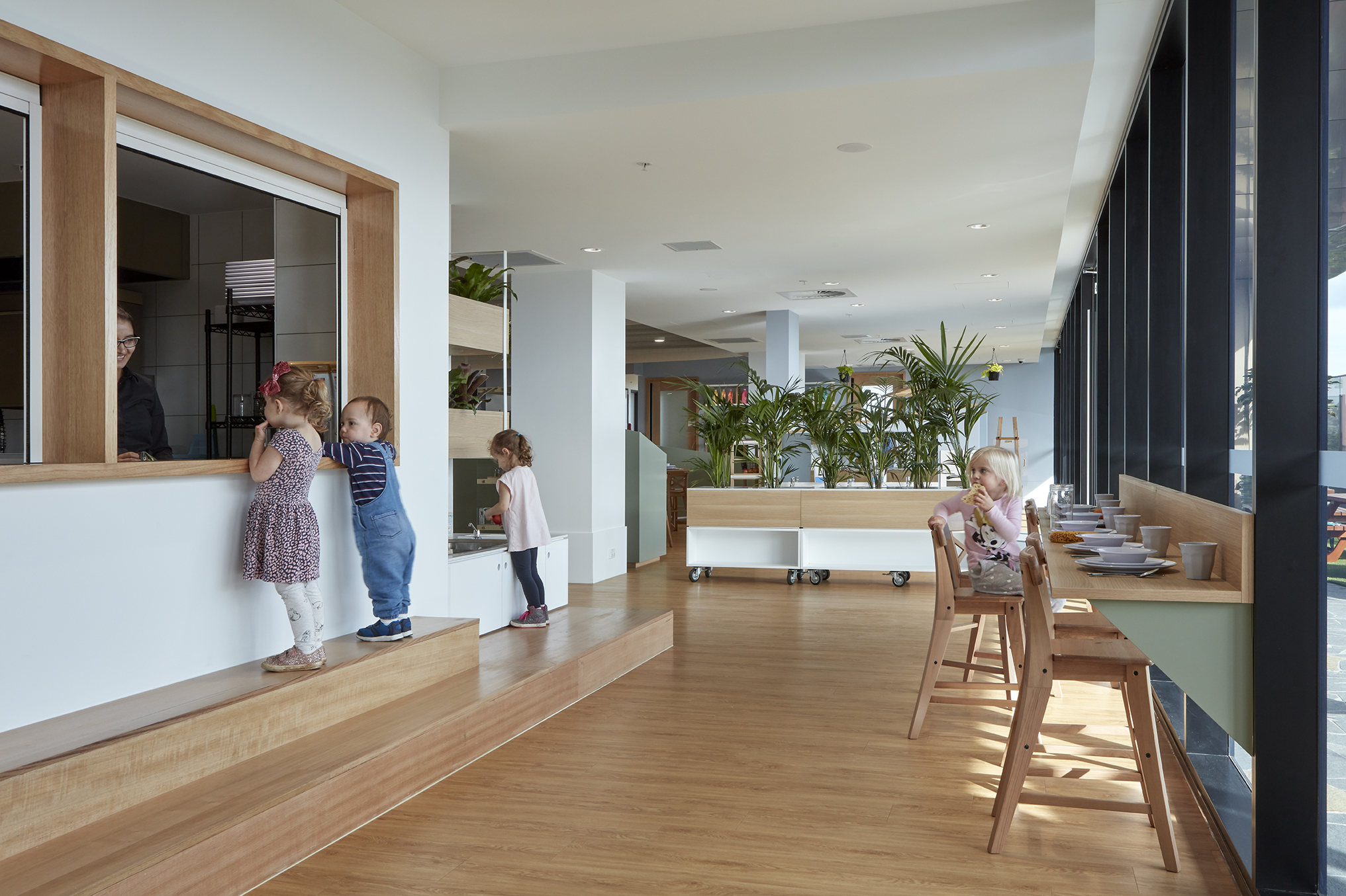 The interior is defined by operable joinery and integrated learning elements, including built-in seats, bookshelves, and storage, which allow the floorplate to adapt seamlessly to different activities throughout the day. This flexibility maximizes efficiency, ensuring every square metre of the tenancy contributes to the children’s experience.