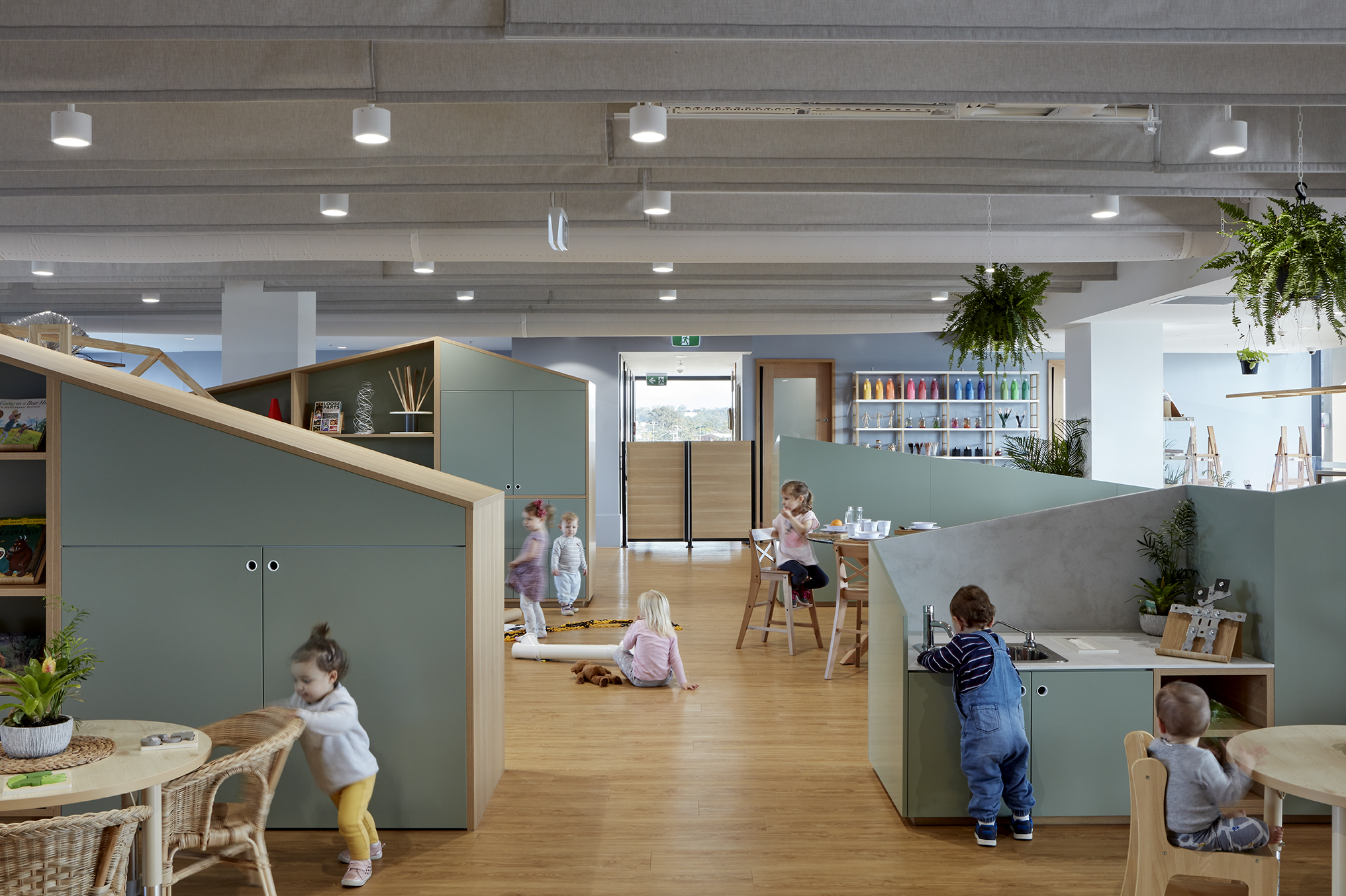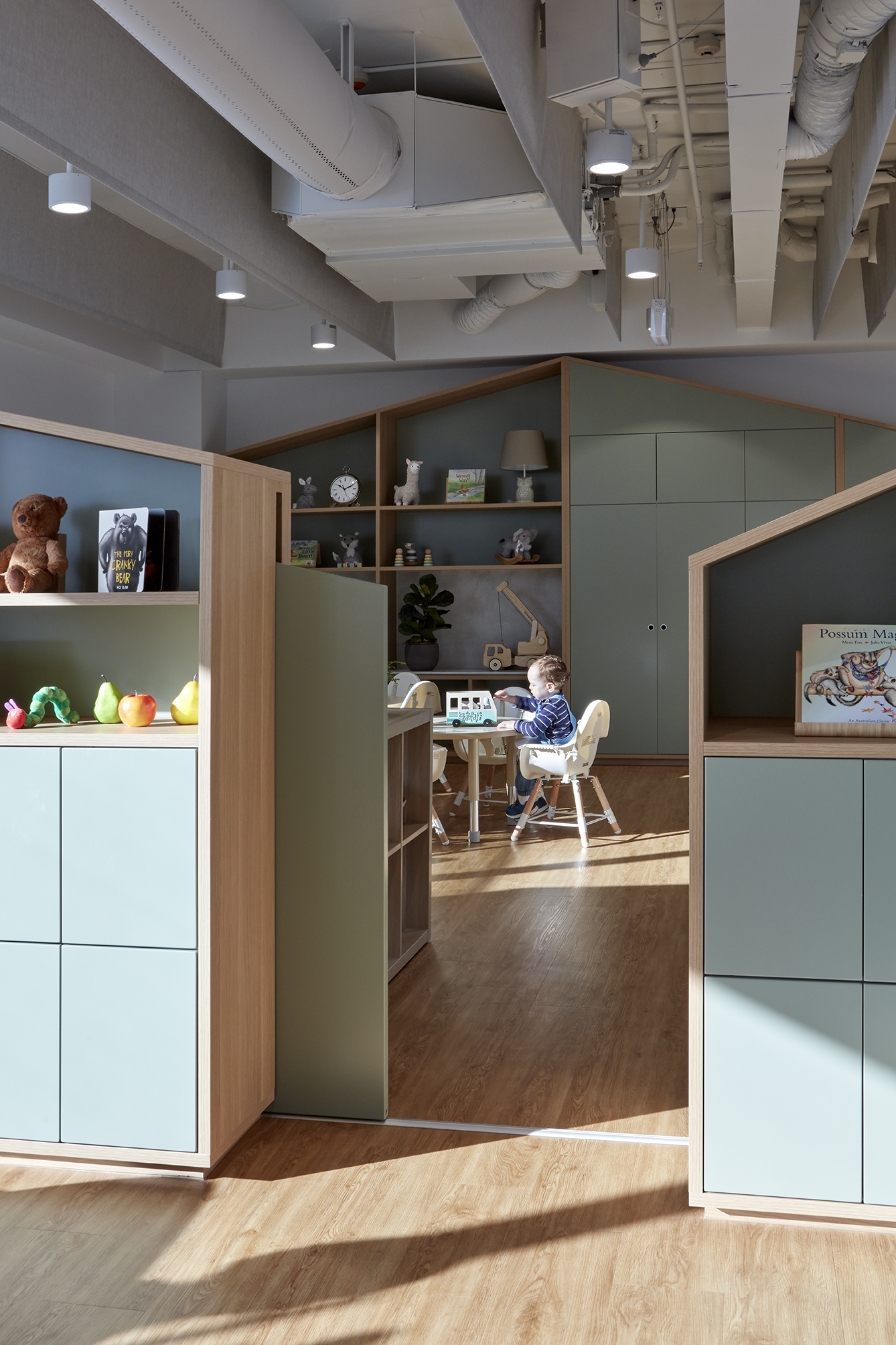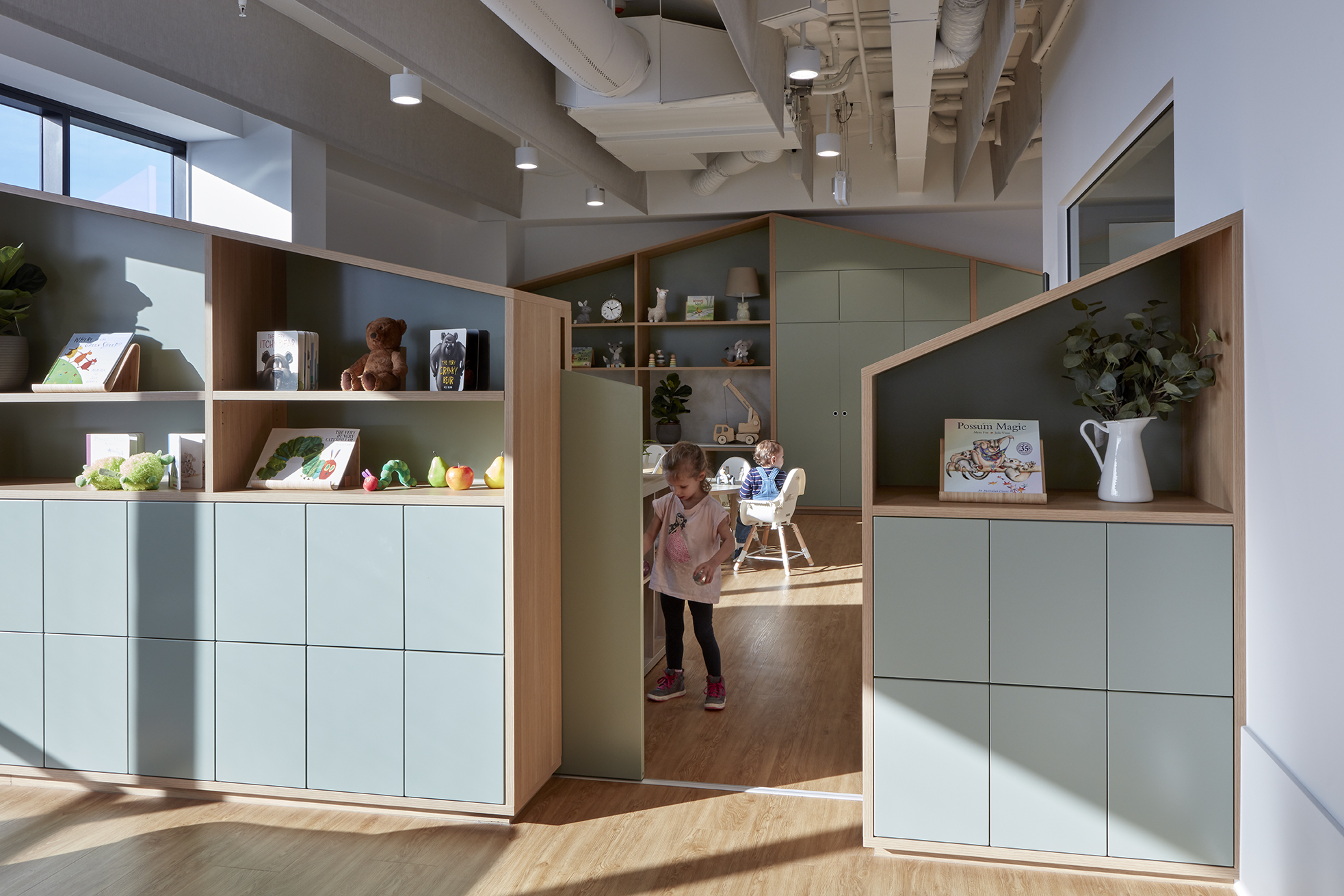 Operable joinery and integrated learning elements, including seating and bookshelves, allow the floorplate to adapt to multiple activities, ensuring maximum efficiency and a playful, flexible environment for children and educators alike.
