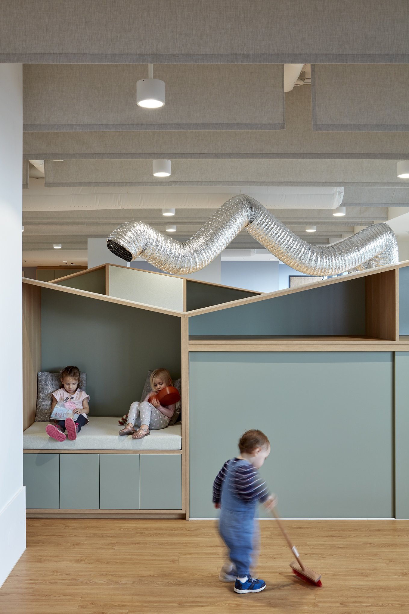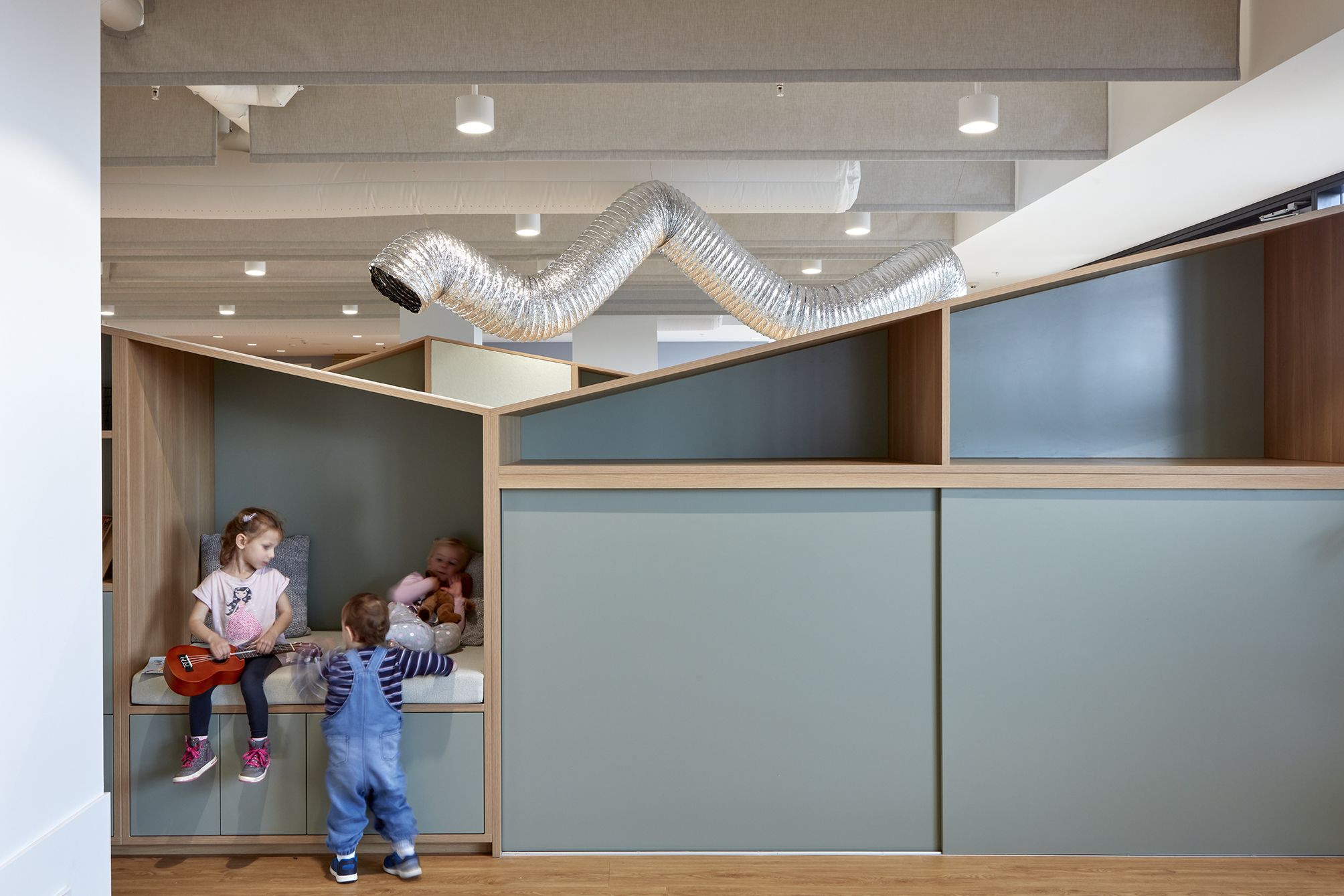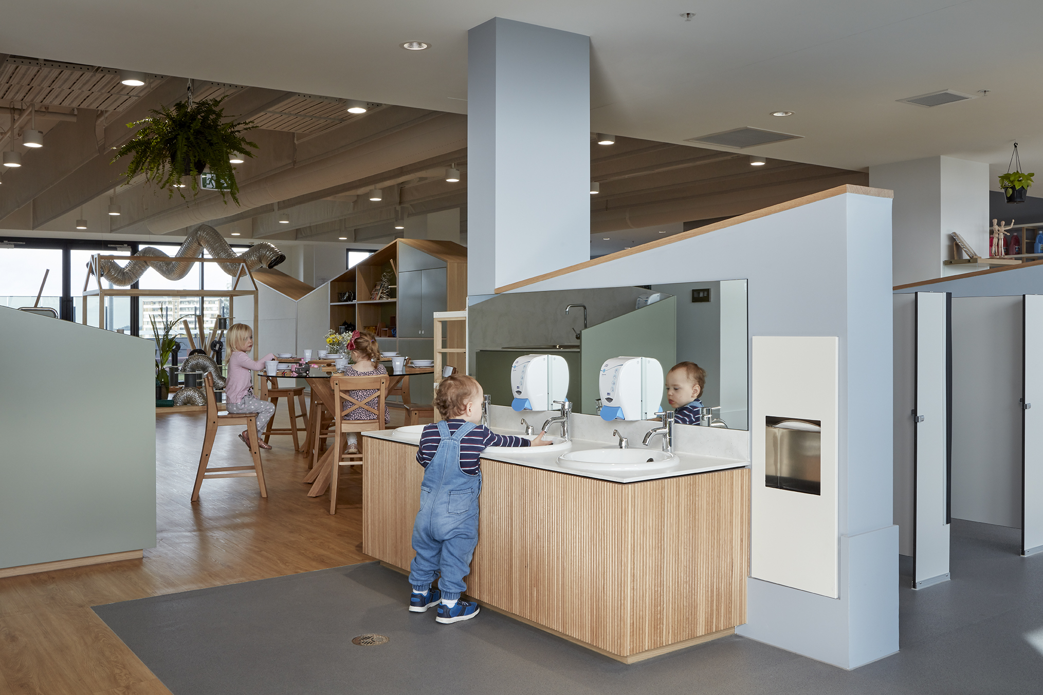 Operable joinery and integrated learning elements, including seating and bookshelves, allow the floorplate to adapt to multiple activities, ensuring maximum efficiency and a playful, flexible environment for children and educators alike.