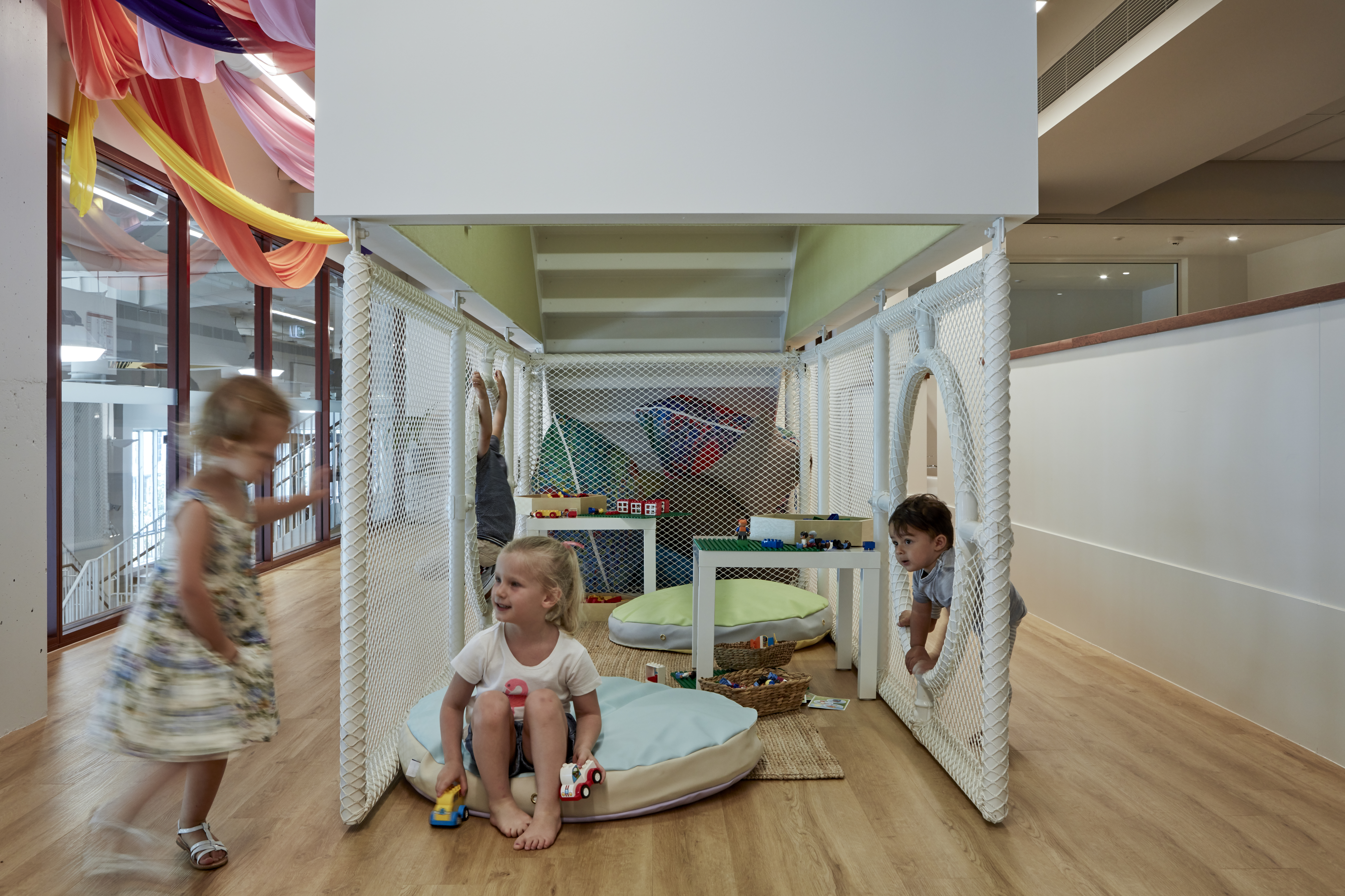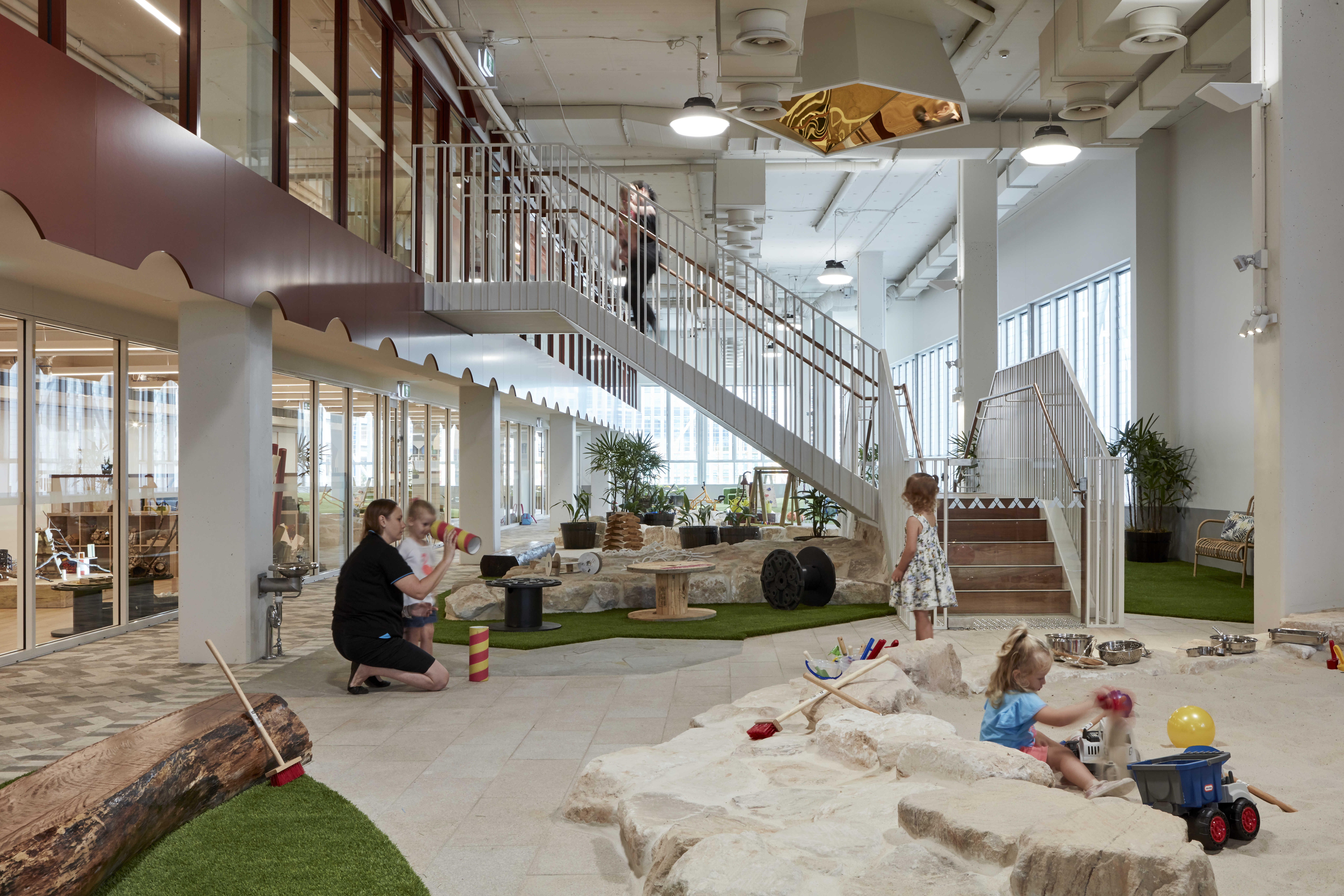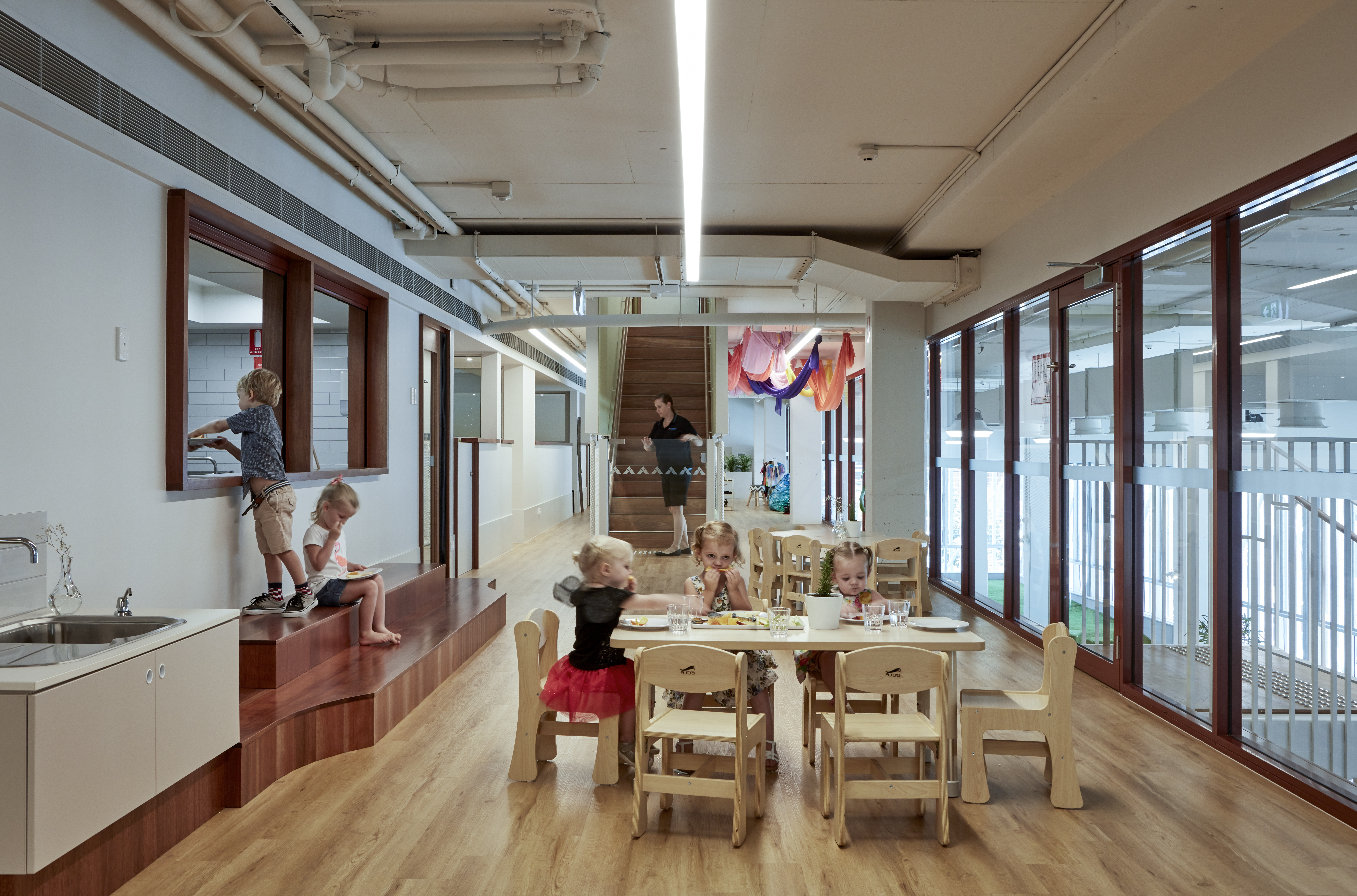 Cross-Laminated Timber (CLT) construction allowed the addition of a mezzanine floor under the high ceilings, creating space for 20 extra children and ensuring financial viability. A tenancy-long void beside the mezzanine strengthens visual connection across levels, supporting supervision and encouraging movement between floors.