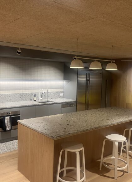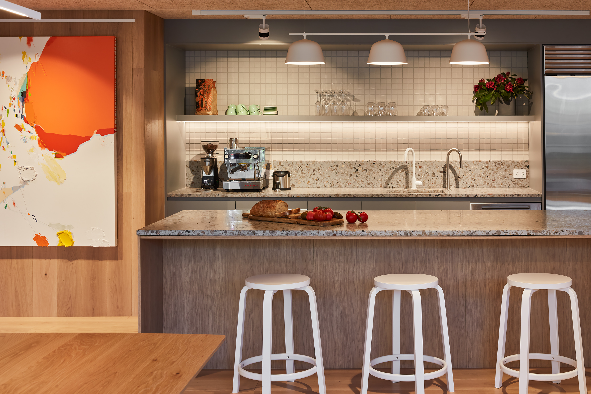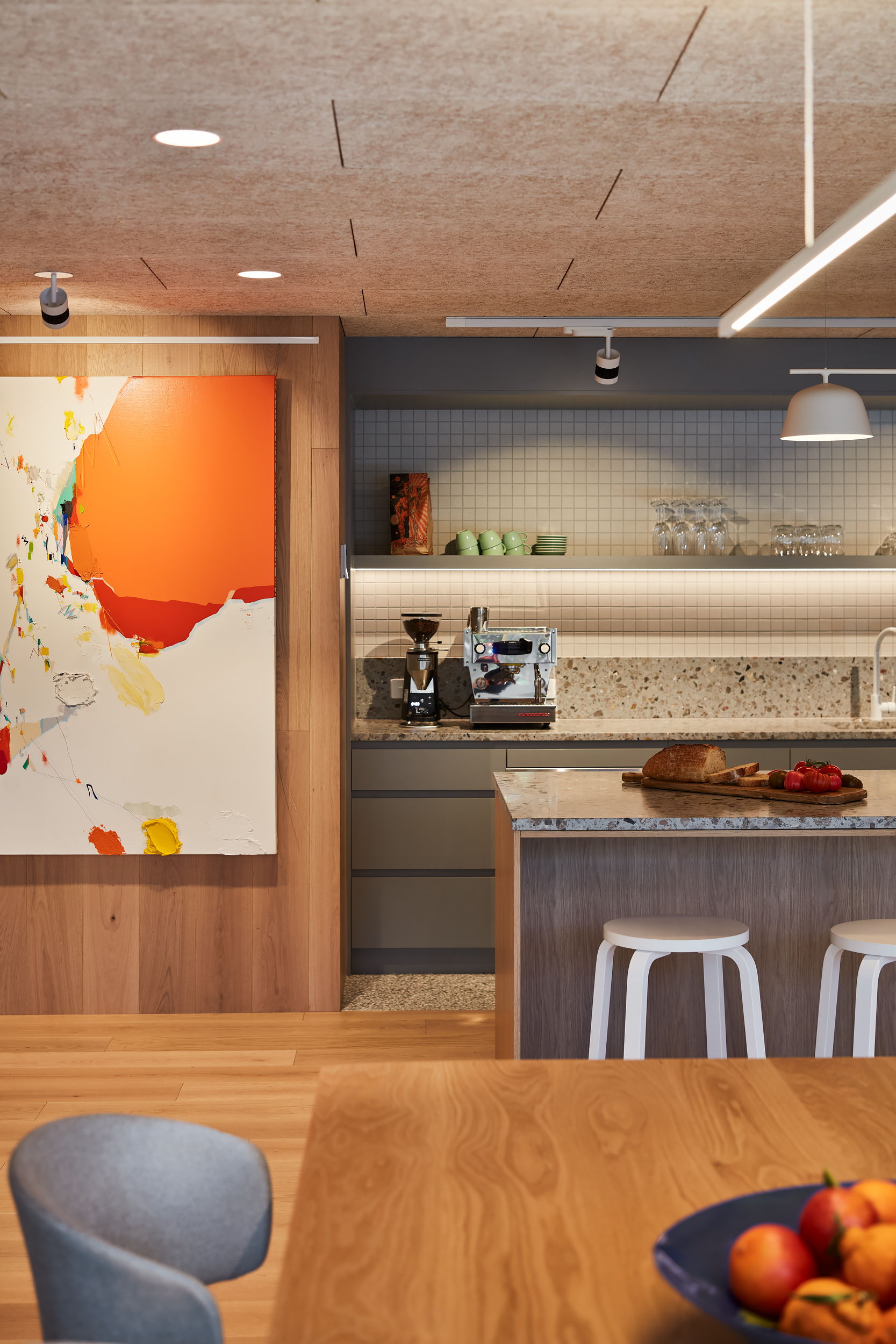 Rich timber flooring flows through the office, complemented by timber wall panelling and custom doors that bring natural warmth to the interiors. Terrazzo benchtops add refined, tactile detail, while Cewood acoustic ceiling tiles ensure the space is as functional as it is beautiful—softening sound, enhancing focus, and making collaboration seamless.